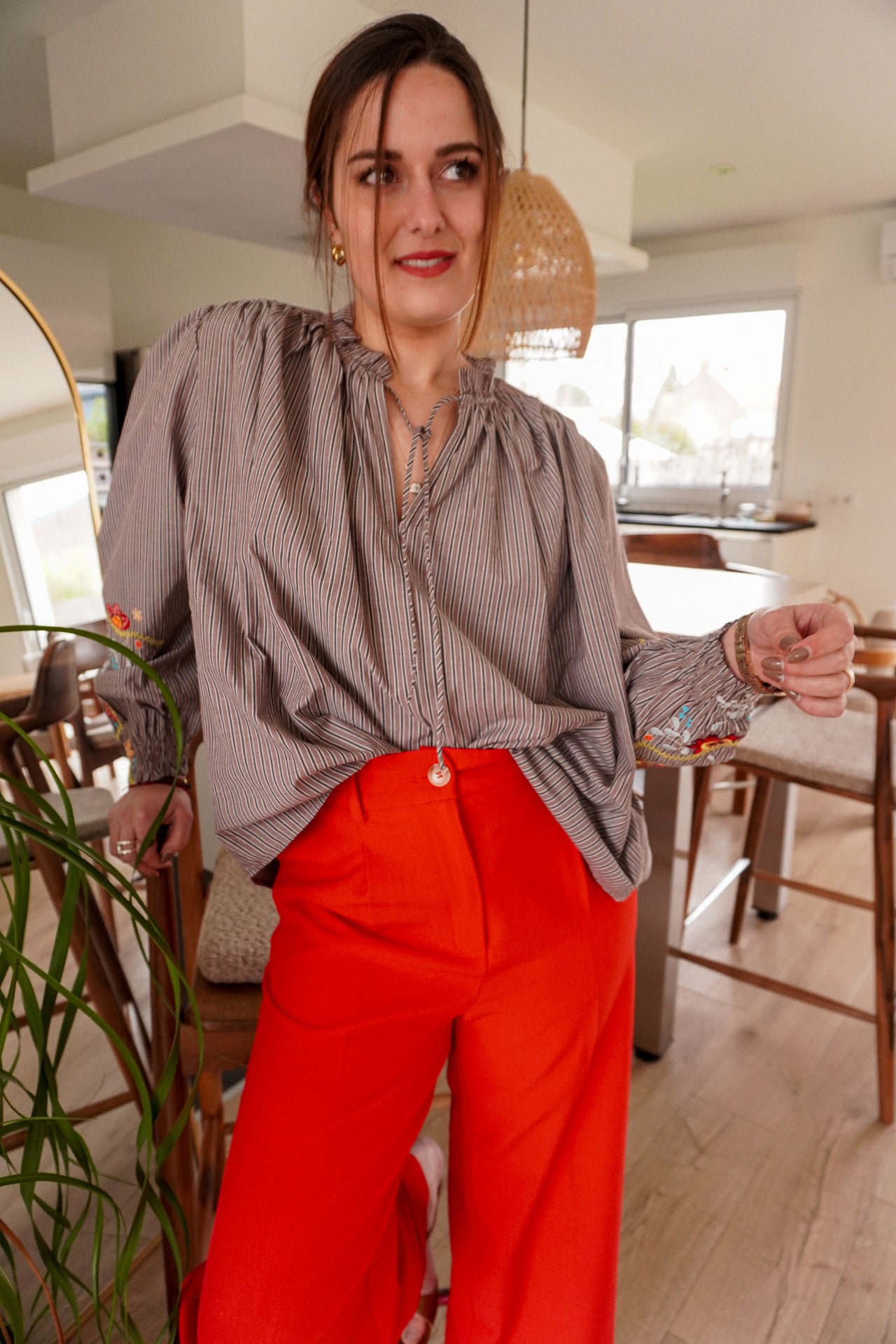 On craque pour ses finitions travaillées : manches délicatement brodées, petits liens à nouer au niveau du col et détails soignés qui font toute la différence. Cette chemise devient rapidement une pièce forte du dressing, facile à porter avec un jean ou un pantalon coloré.