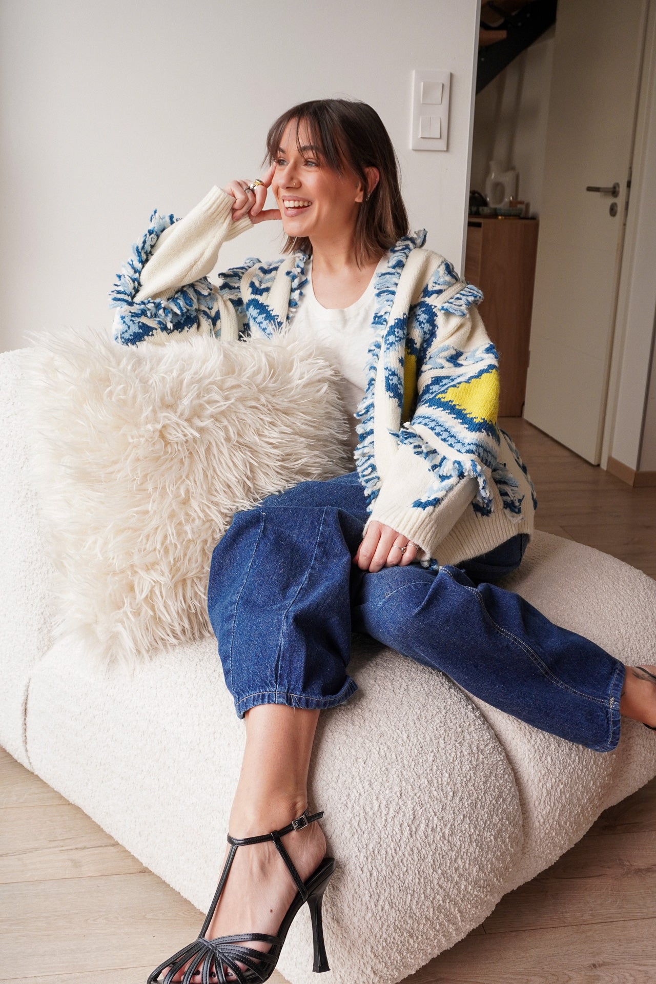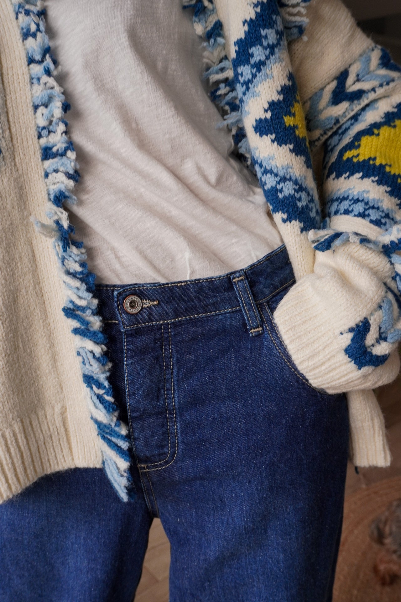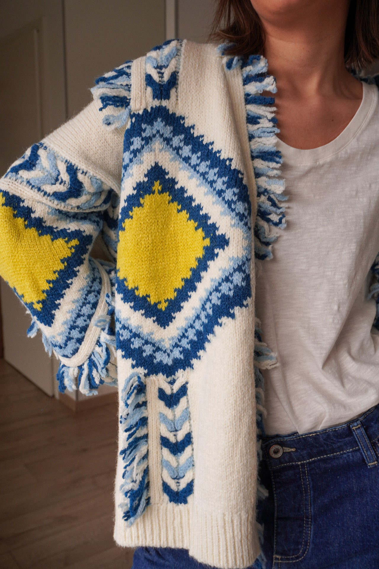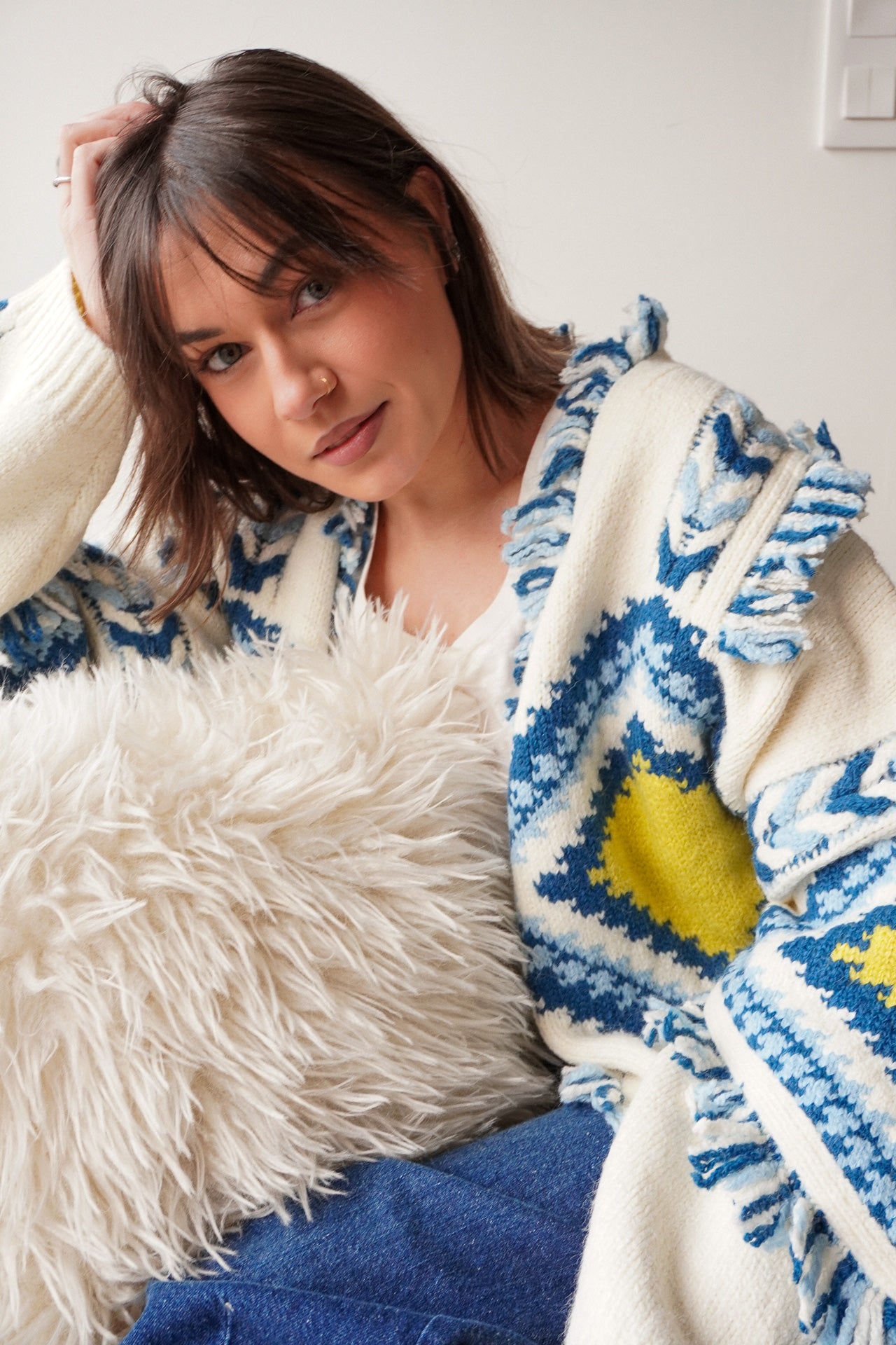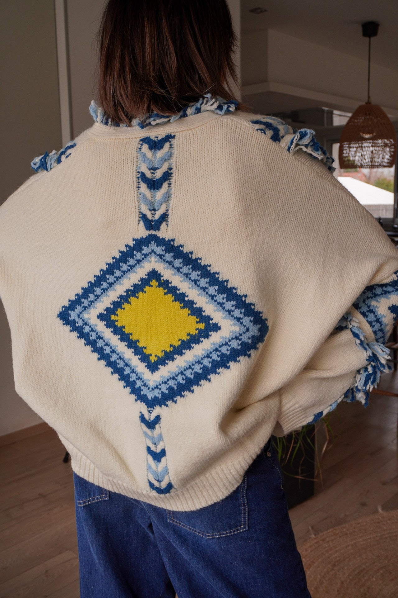 Le gilet Tromso est la pièce parfaite pour réchauffer vos looks avec style. Son imprimé graphique aux tons bleus, jaunes et écrus apporte une vraie personnalité à la tenue, idéale pour un esprit bohème et décontracté.