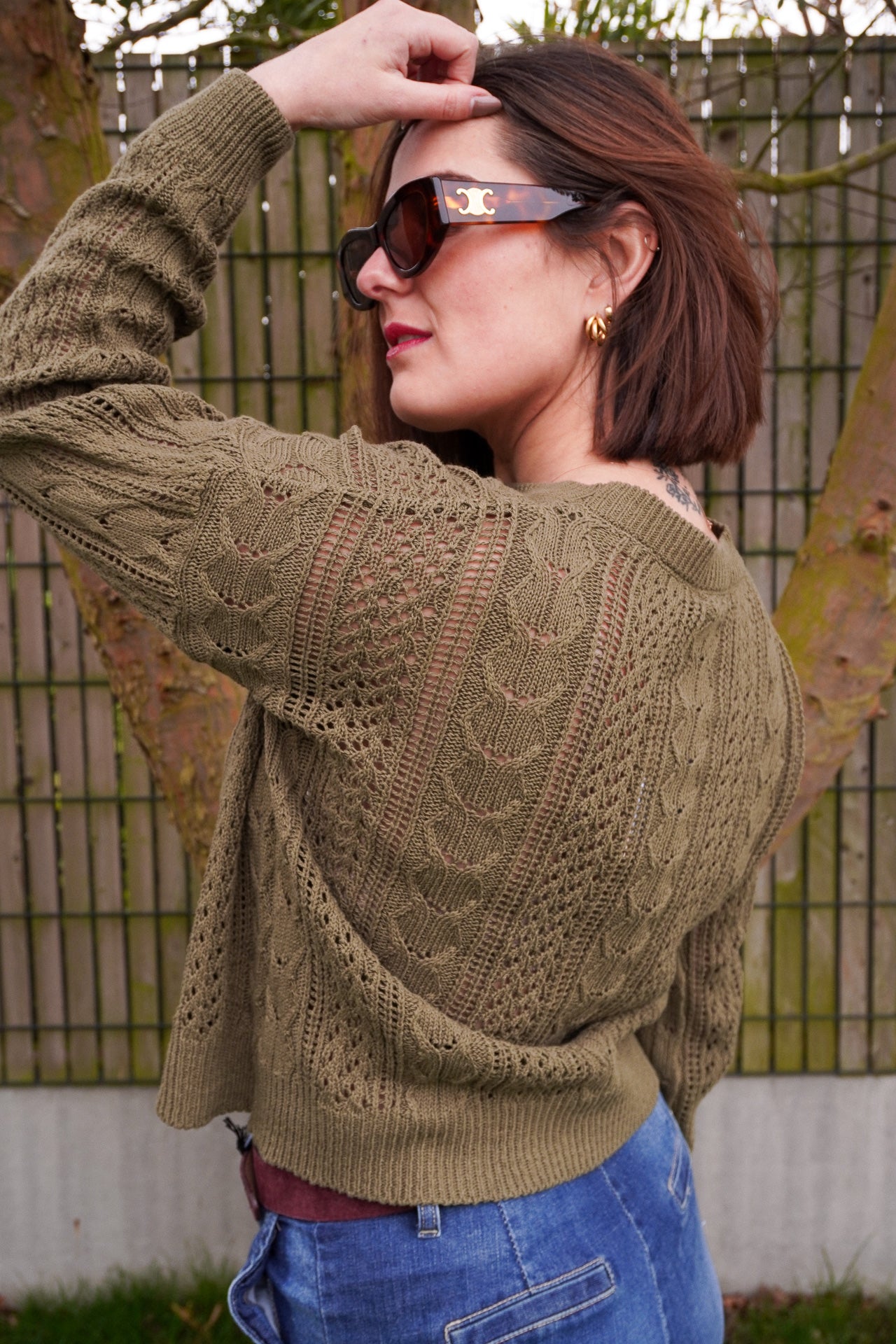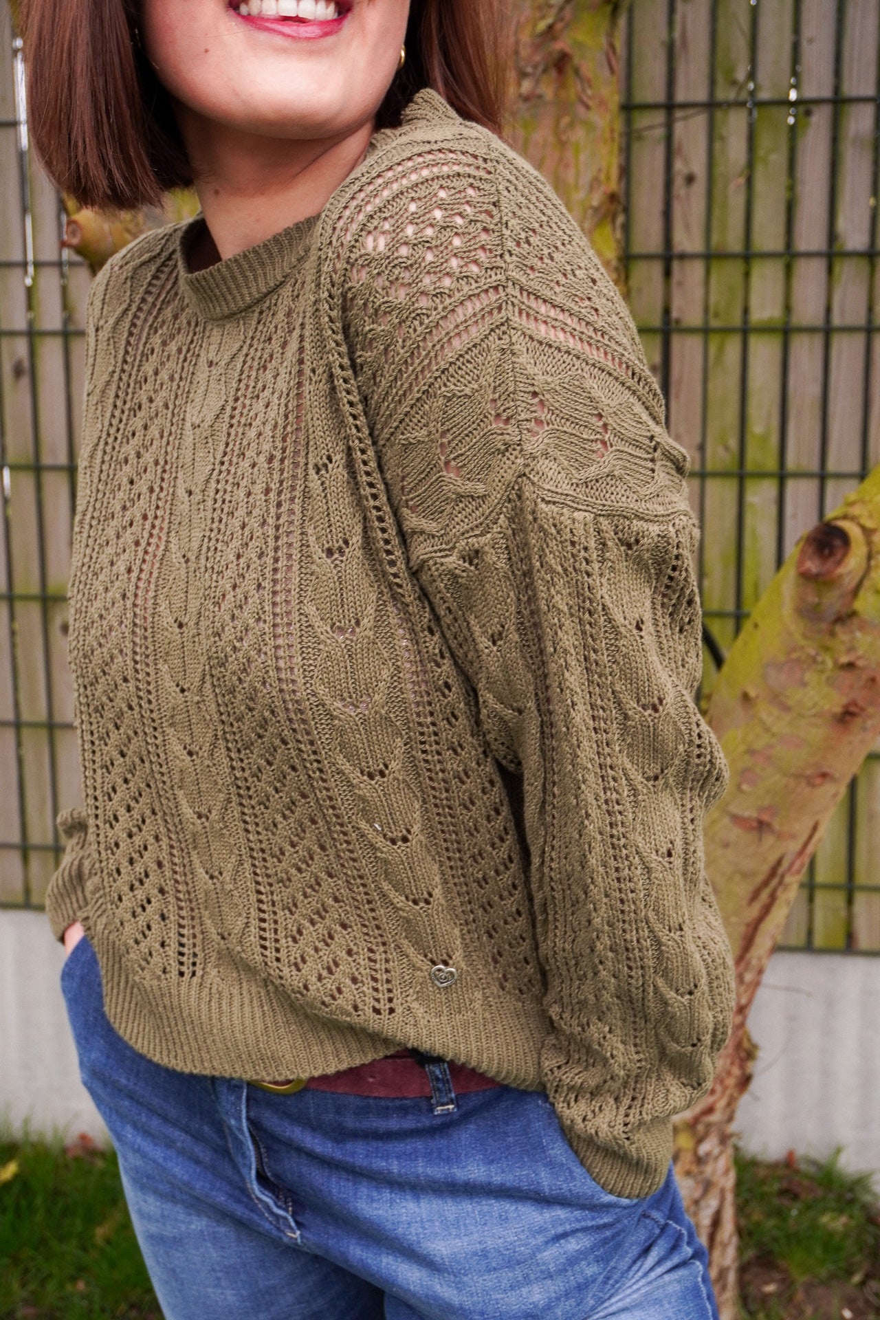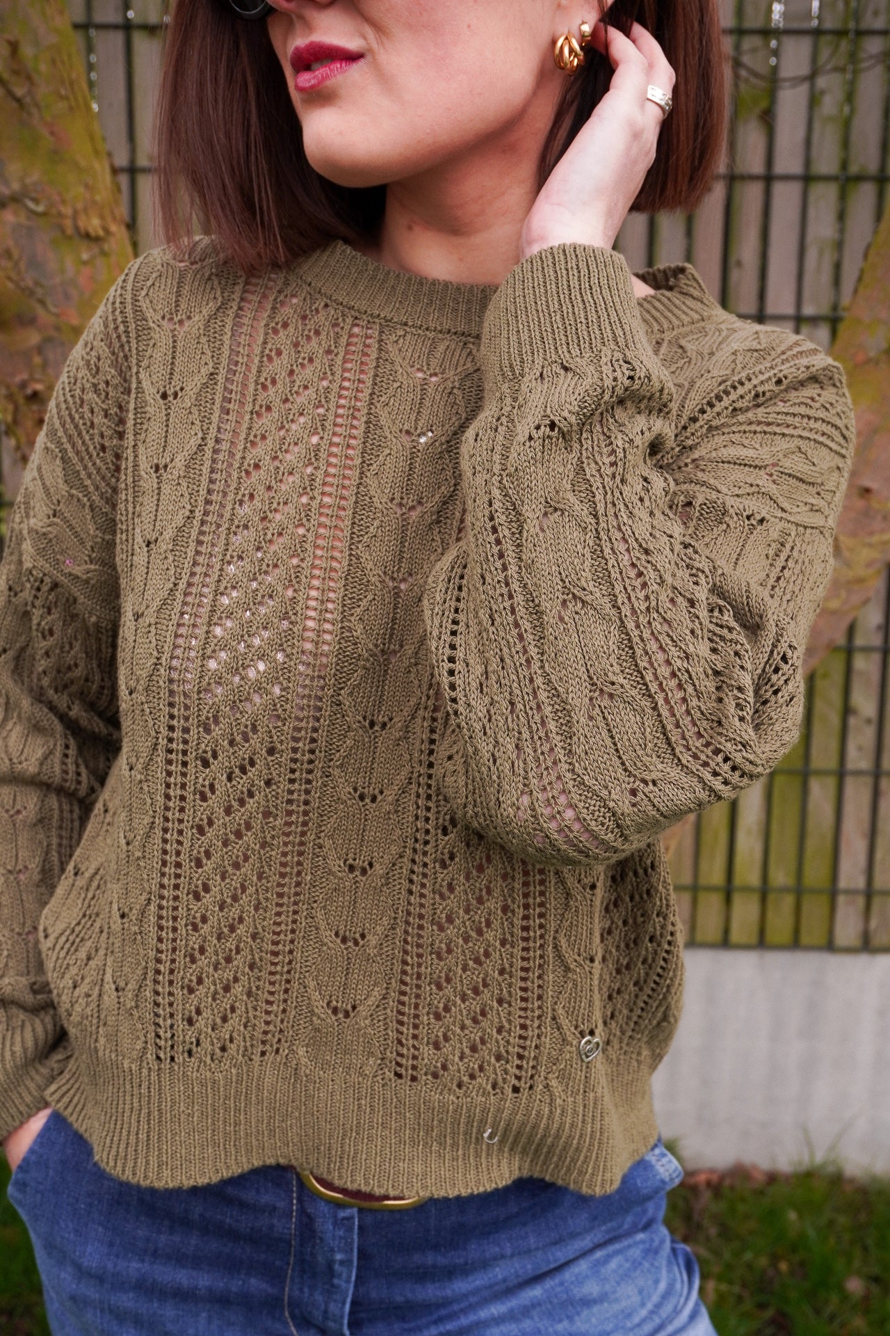 Le pull Glow kaki de la marque Please apporte une touche bohème chic grâce à son maille ajourée et son style féminin tout en légèreté.