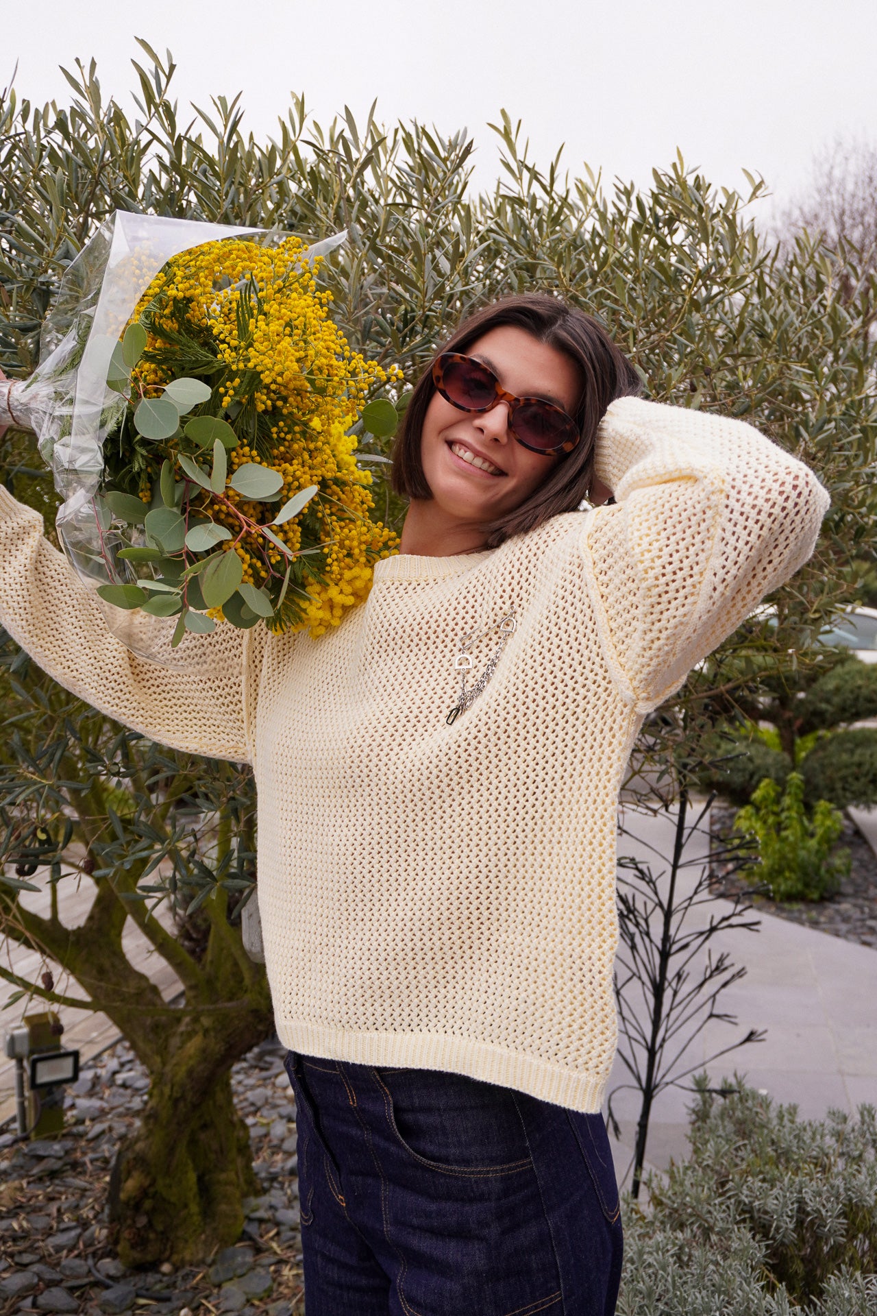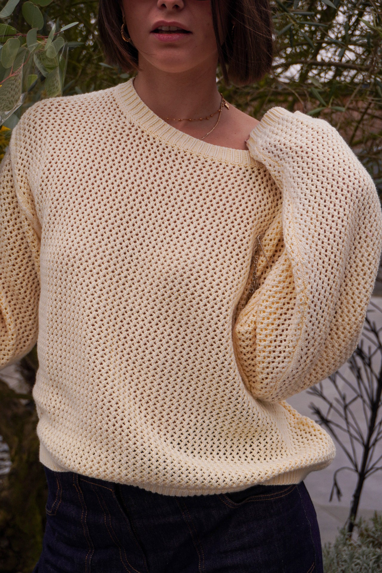 Sa teinte écrue, douce et intemporelle, permet de l’associer facilement à un jean brut, un pantalon habillé ou une jupe plus féminine. Le détail signature : sa broche pendentif à breloques argentées, entièrement amovible, qui permet de personnaliser le style selon l’envie du jour.