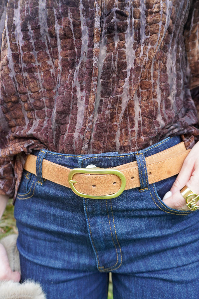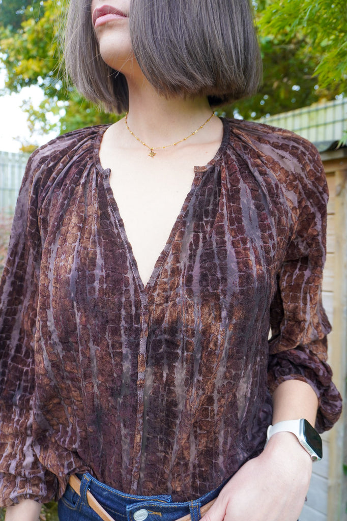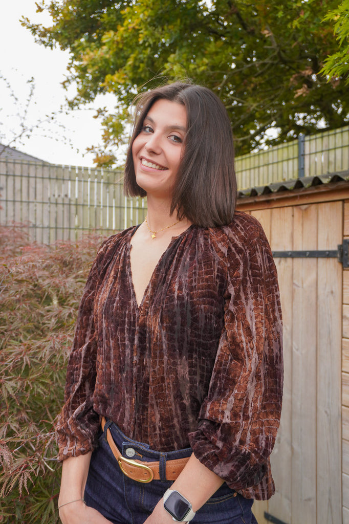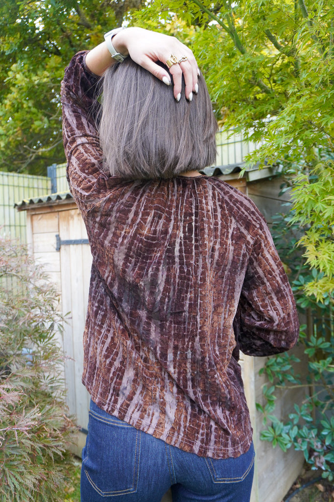 La blouse Nicole signée See U Soon séduit par son charme bohème et sa texture veloutée. Réalisée dans un tissu fluide au toucher doux, elle présente un imprimé texturé dans des nuances profondes de brun et d’acajou, parfait pour la saison. Son encolure légèrement dégagée et ses manches souples apportent féminité et aisance, tandis que sa coupe vaporeuse sublime toutes les silhouettes. À porter avec un jean brut pour un look casual chic ou rentrée dans une jupe pour une allure plus sophistiquée, la blouse Nicole est la pièce coup de cœur de l’automne.