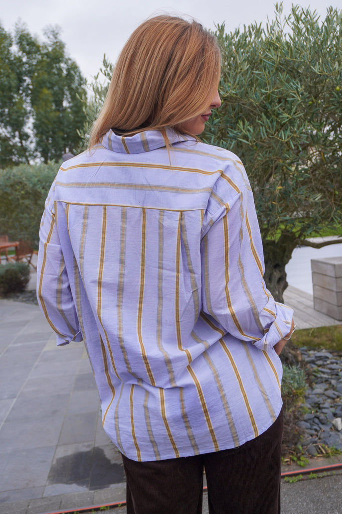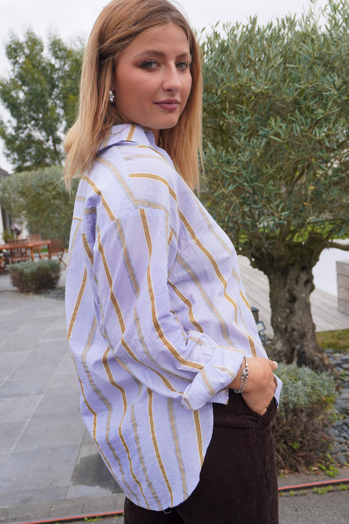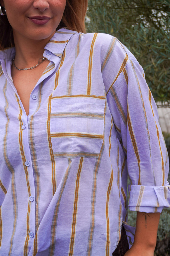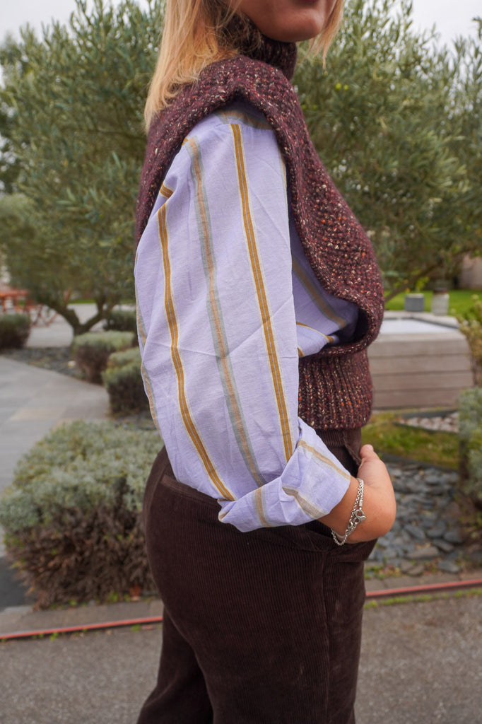 Légère et pleine de caractère, la chemise Ilona signée See U Soon apporte une touche de fraîcheur au vestiaire d’automne. Confectionnée dans un doux mélange de coton et de lin (90 % coton, 10 % lin), elle séduit par sa matière naturelle et sa coupe fluide qui épouse le mouvement sans contrainte. Ses rayures verticales aux tons lilas et ocre allongent la silhouette et insufflent un esprit lumineux et décontracté. Portée rentrée dans un pantalon taille haute ou ouverte sur un top, elle incarne l’équilibre parfait entre allure citadine et nonchalance chic.