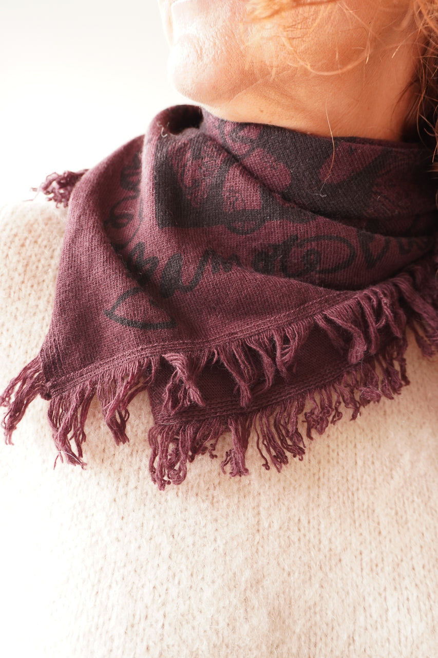 Son imprimé cœur ton sur ton et sa couleur bordeaux profonde en font l’allié parfait pour réchauffer vos looks d’automne.