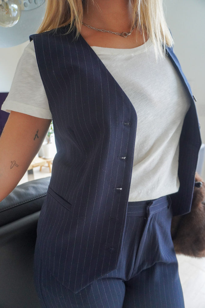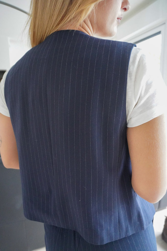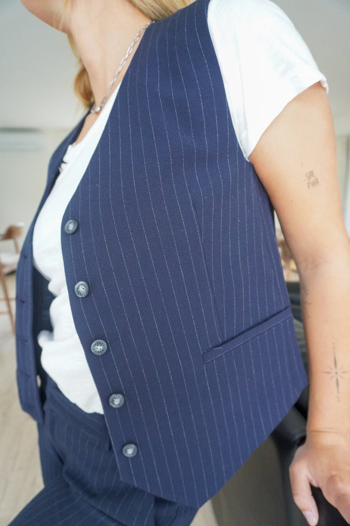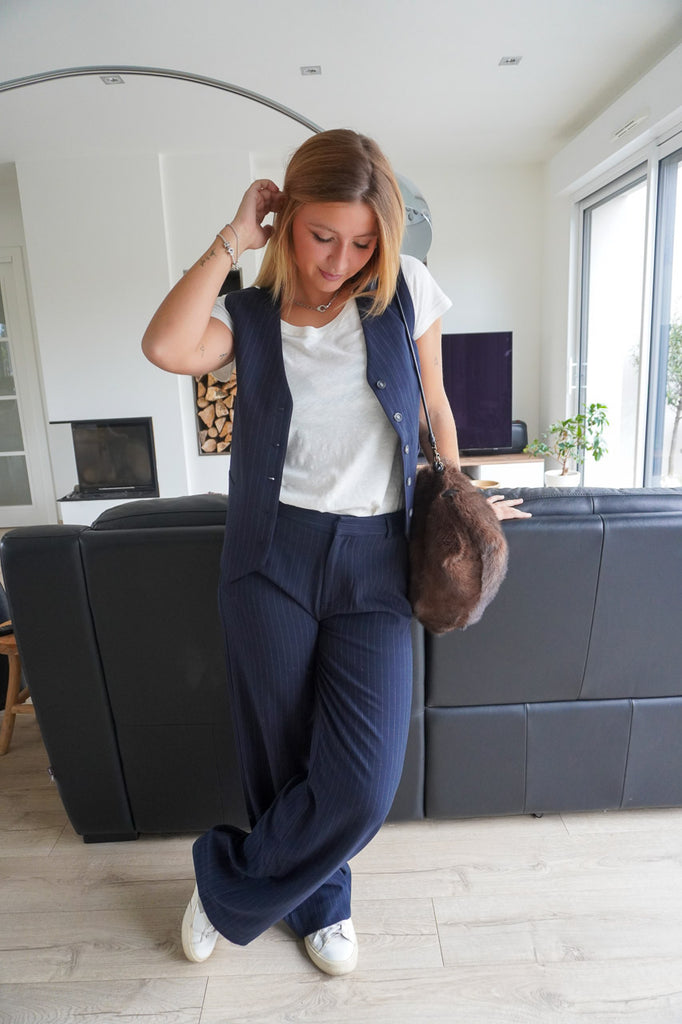Le gilet Malice signé Yerse revisite l’allure tailleur avec une touche de modernité et de féminité. Confectionné dans un tissu bleu marine à fines rayures, il séduit par sa coupe ajustée et sa texture fluide, qui épouse la silhouette sans la contraindre. Sa matière recyclée offre un tomber élégant et une tenue impeccable, parfaite pour structurer une allure citadine. Porté sur un t-shirt pour une version décontractée ou coordonné à son pantalon assorti pour un look tailoring affirmé, il s’impose comme une pièce forte du vestiaire féminin Joy & Léa.
