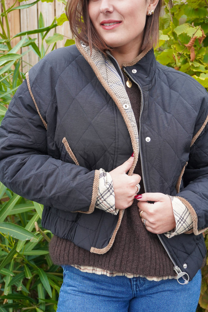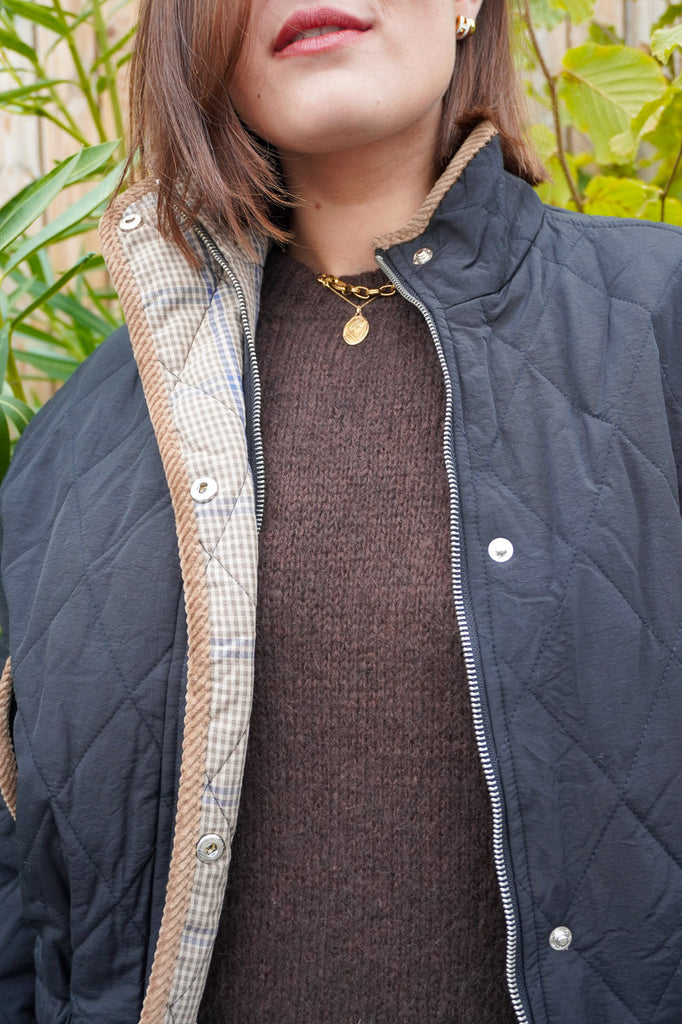 La veste Katelin signée Adoré Paris revisite la doudoune matelassée dans une version chic et contemporaine. Entièrement conçue en 100 % polyester, elle se distingue par son effet légèrement oversize, son jeu de surpiqûres en losanges et ses finitions contrastées en velours côtelé. Doublée d’un motif à carreaux pour une touche British, elle conjugue confort, chaleur et style. Son allure rétro et ses détails camel apportent une note singulière à n’importe quelle silhouette, du jean casual à la jupe midi.