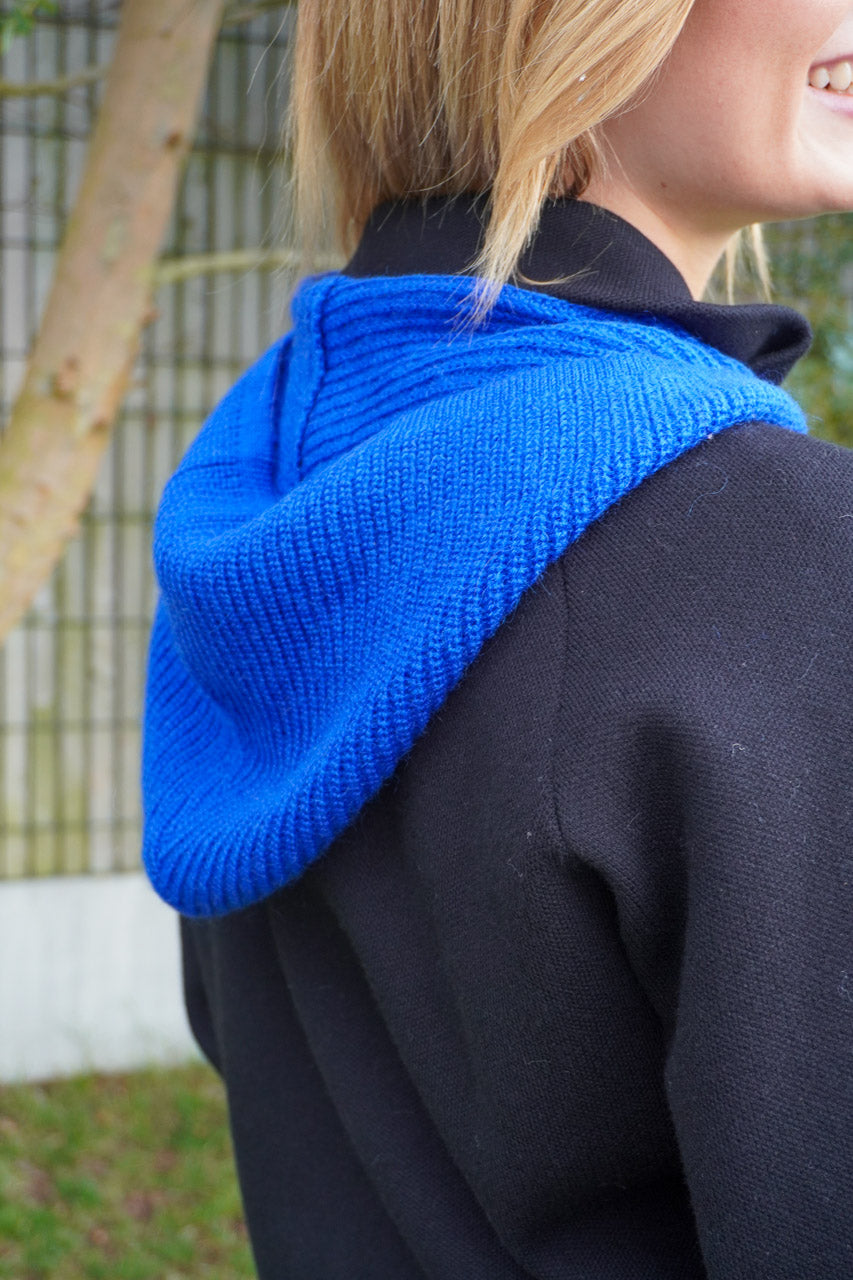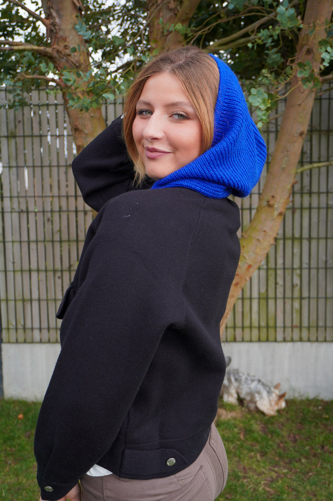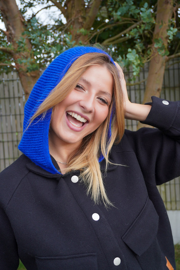 Sa maille épaisse dans un coloris carbone profond contraste avec élégance avec sa capuche tricotée rose, amovible grâce à de discrets boutons pression. Une pièce à la fois confortable et stylée, parfaite dès la mi-saison — sur un jean, un pantalon blanc ou même une jupe fluide pour une touche mode inattendue.