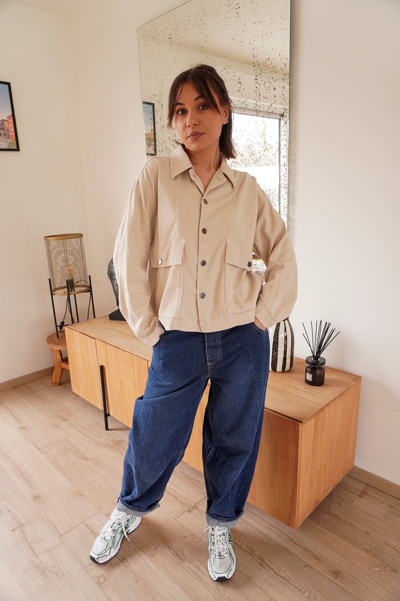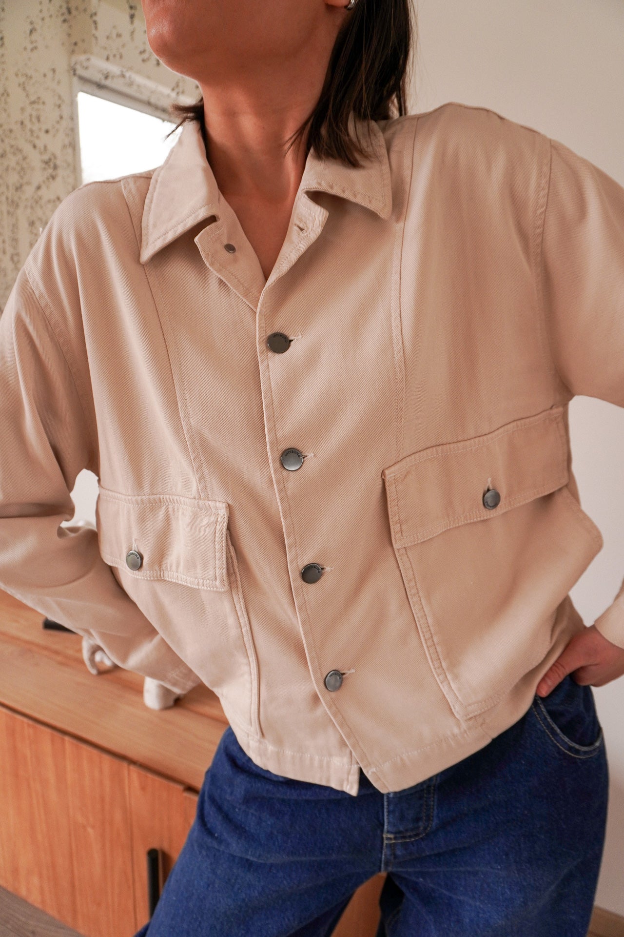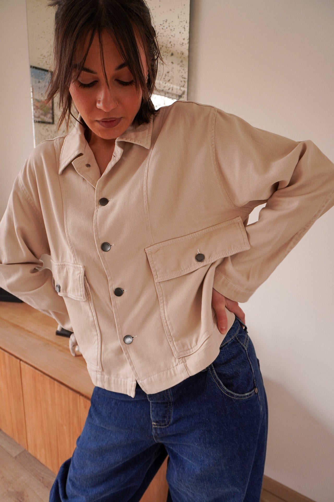 La veste Suzanne Indi & Cold allie style utilitaire et élégance décontractée dans une teinte beige douce et lumineuse, idéale pour la mi-saison.