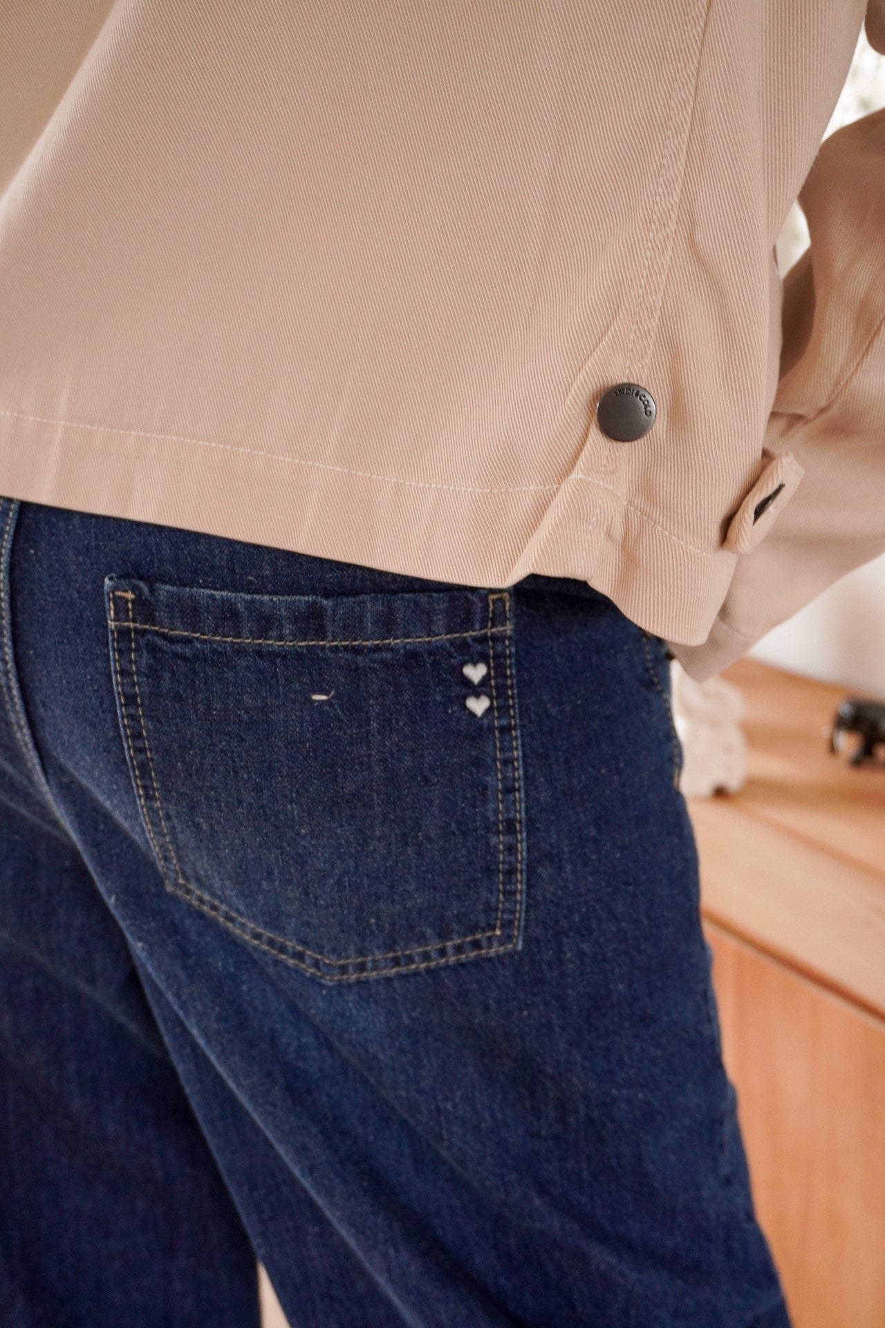 Pensée pour le quotidien, elle se distingue par ses grandes poches plaquées et sa fermeture frontale à boutons. Un passant ajustable avec bouton au dos permet d’adapter subtilement la coupe selon vos envies.