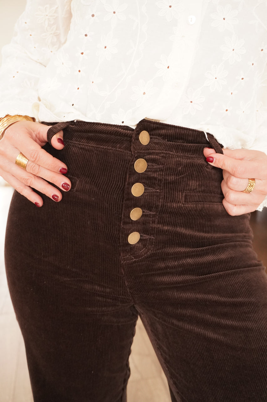 Le pantalon Achille d’Oraije apporte une touche chic et chaleureuse grâce à son velours chocolat ultra tendance. Sa coupe flatteuse est sublimée par de boutons dorés qui ajoutent une note élégante. Confectionné en 97% coton et 3% élasthanne, il offre douceur, confort et une belle souplesse au quotidien. Un basique revisité, idéal pour composer des looks d’automne et d’hiver modernes et féminins.