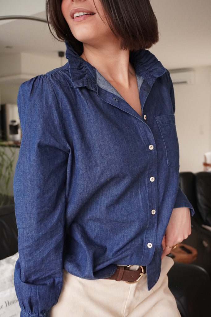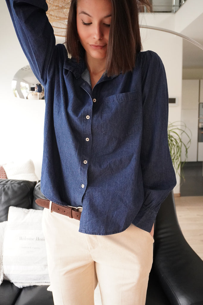 La chemise Maglia de Ycoo Paris revisite l’intemporel denim avec une touche féminine grâce à ses froufrous sur le col. Confectionnée en 100% coton, elle offre un confort naturel et une tenue impeccable. Sa coupe droite et ses manches longues en font une pièce facile à porter, aussi bien rentrée dans un pantalon que superposée sous un pull.