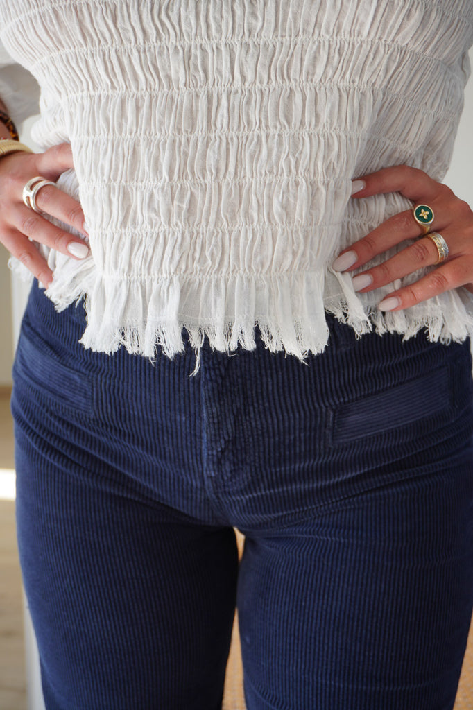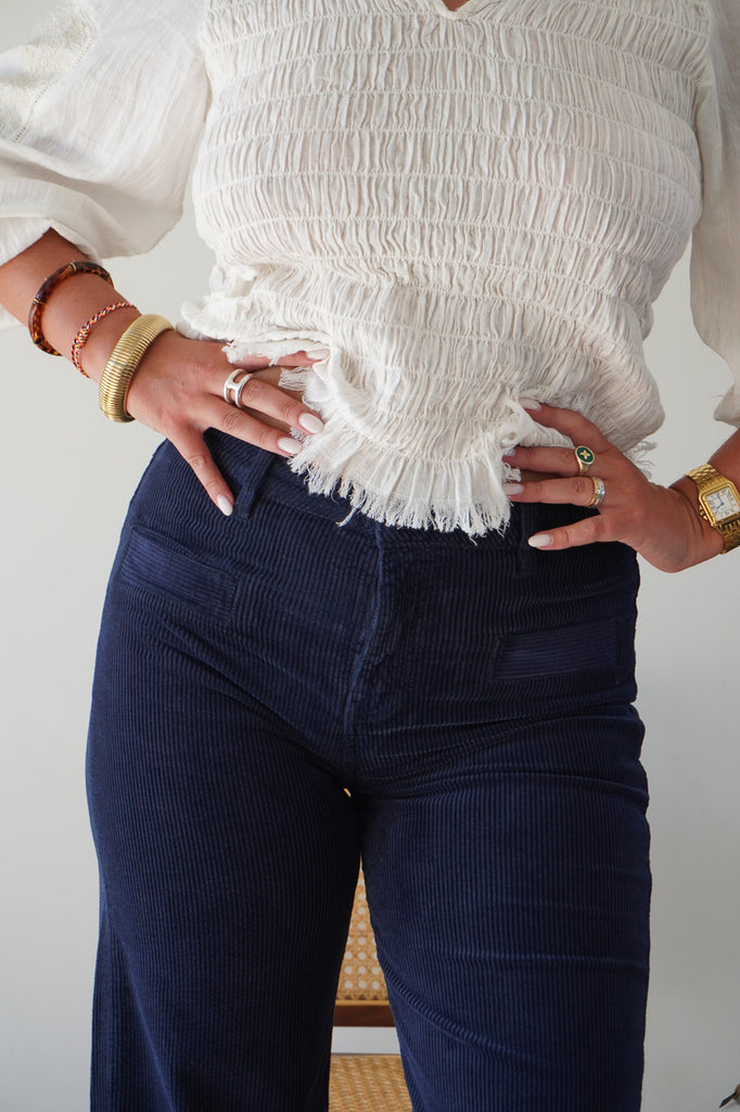 Polyvalent, ce pantalon en velours bleu marine femme se porte facilement avec une chemise blanche pour un look intemporel, ou avec un pull oversize pour une allure plus casual chic. Une pièce essentielle de la collection À contre saison, pensée pour conjuguer confort, chaleur et raffinement.
