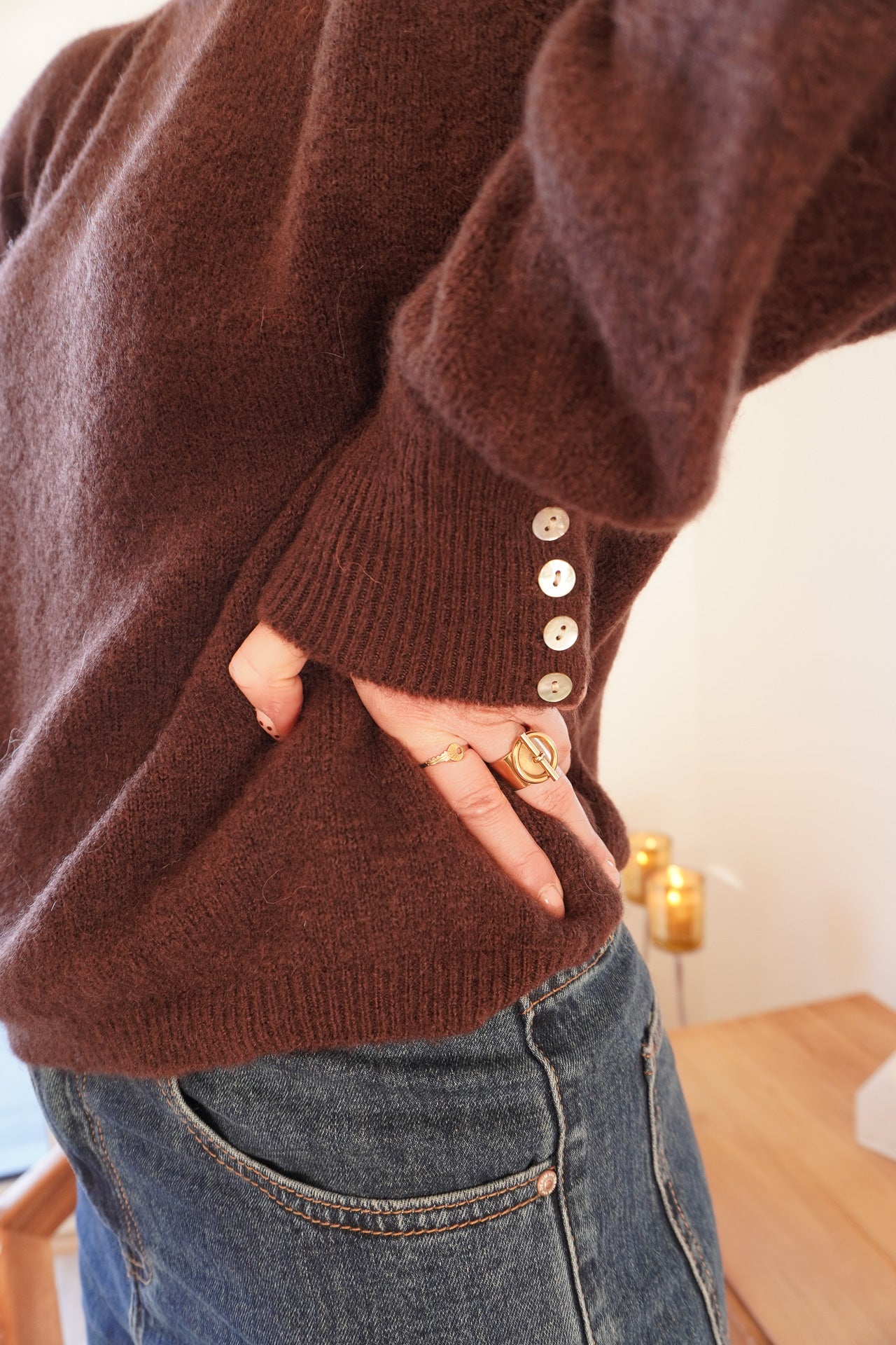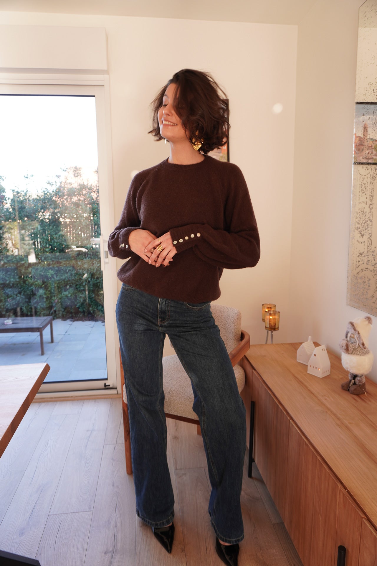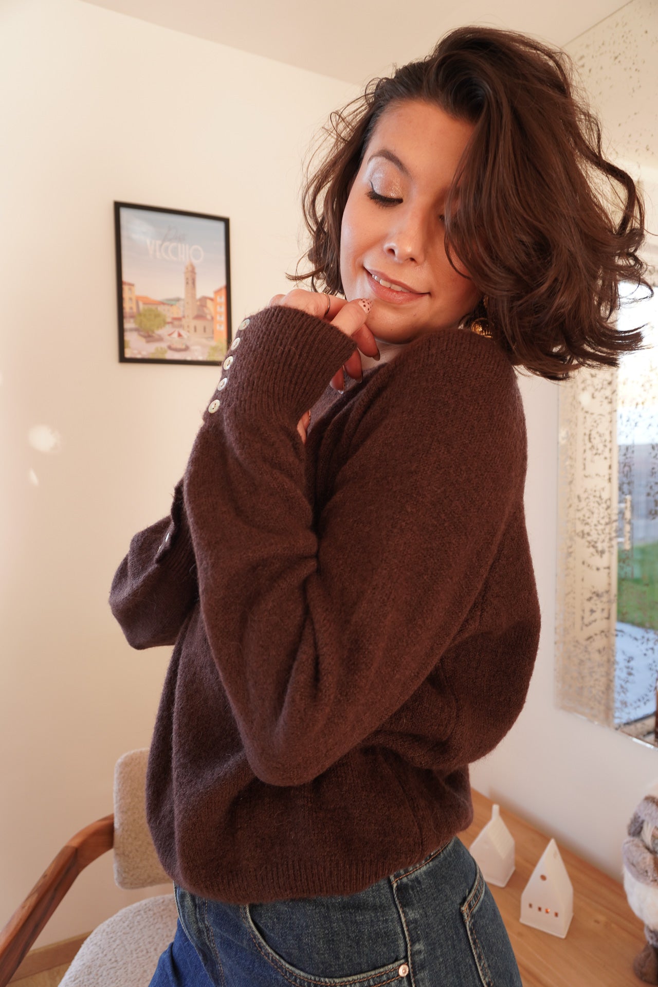 Le col rond, les manches longues légèrement tombantes et les boutons délicats au poignet apportent une sophistication discrète, parfaite pour rehausser une tenue simple.